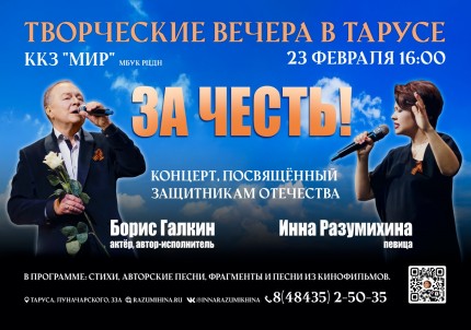 23 февраля 2024 в 16:00, г. Таруса. КОНЦЕРТ ПОСВЯЩЕННЫЙ ЗАЩИТНИКАМ ОТЕЧЕСТВА «ЗА ЧЕСТЬ!»