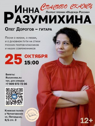 "Спасибо скажу" Творческий вечер-концерт Инны Разумихиной![]() Концертная программа лауреата Всероссийских и Международных конкурсов ИННЫ РАЗУМИХИНОЙ, "Спасибо скажу" - это приглашение слушателя к искреннему разговору о жизни, любви и духовном поиске. В сопровождении двух гитар, при участии музыканта Олега Дорогова, Инна исполнит песни на стихи известных русских поэтов-классиков и современных авторов. Её проникновенные композиции ставят перед слушателями глубокие философские вопросы: — Почему человеческая жизнь столь быстротечна, тогда как чувство любви кажется вечным?— Каково предназначение души, связанной земными узами? Название концерта отражает взгляд на жизнь исполнительницы, вдохновлённой словами игумена Тихона (Борисова): «Смотри вперёд — с надеждой, назад — с благодарностью, наверх — с молитвой, вниз — с покаянием, в себя — со вниманием, вокруг — с любовью!» Эта концертная программа станет настоящим подарком поклонникам русской поэзии и современной авторской песни. 1 час 40 минут. 12+ Купить билеты: https://share.google/e3rNFNWC0fy0plKgG |